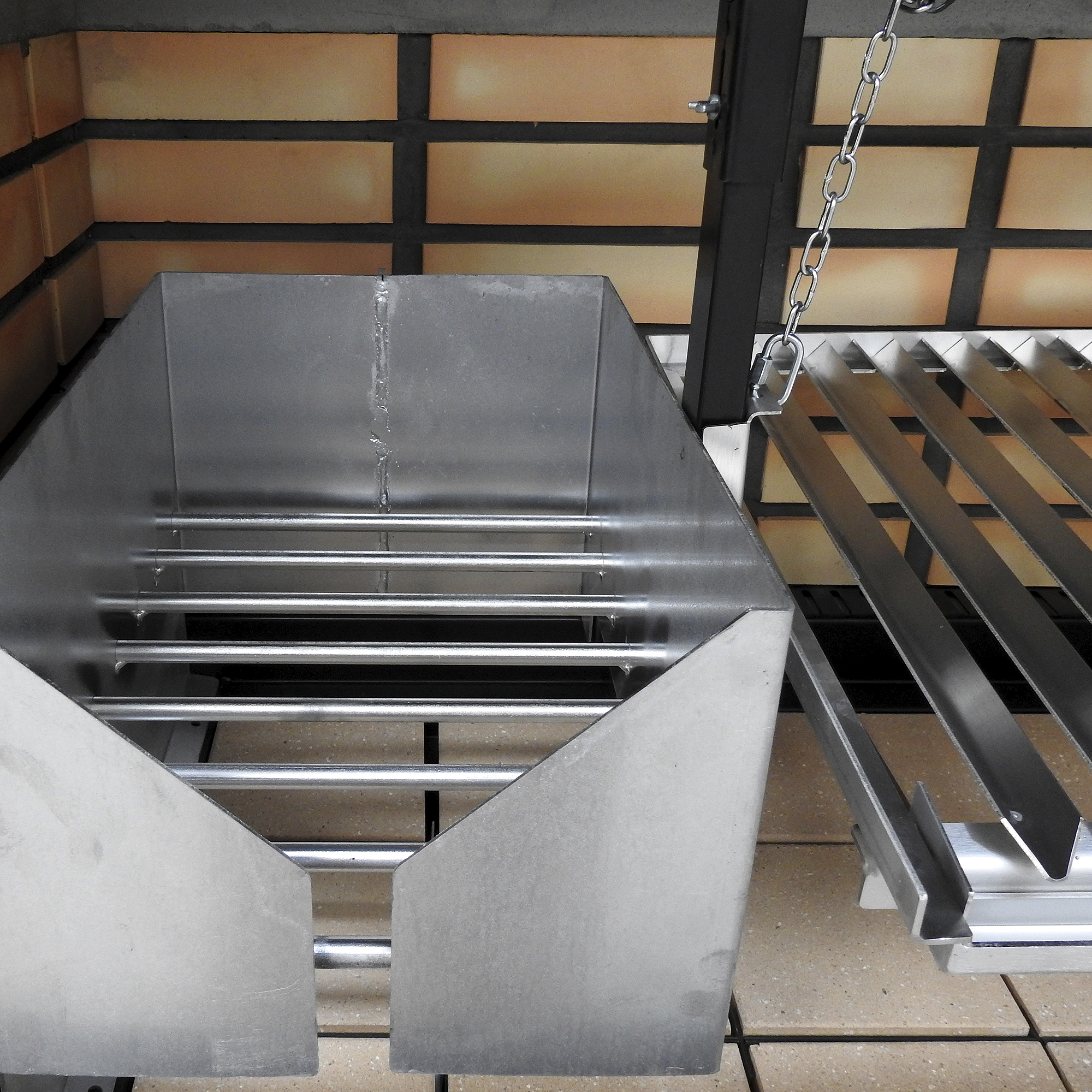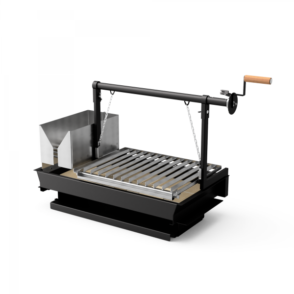 304 Stainless steel grill, argentinian style with grease deposit. Lateral wood burning brazier. Metal drawer for cleaning ashes. Grill elevation through a crank system.