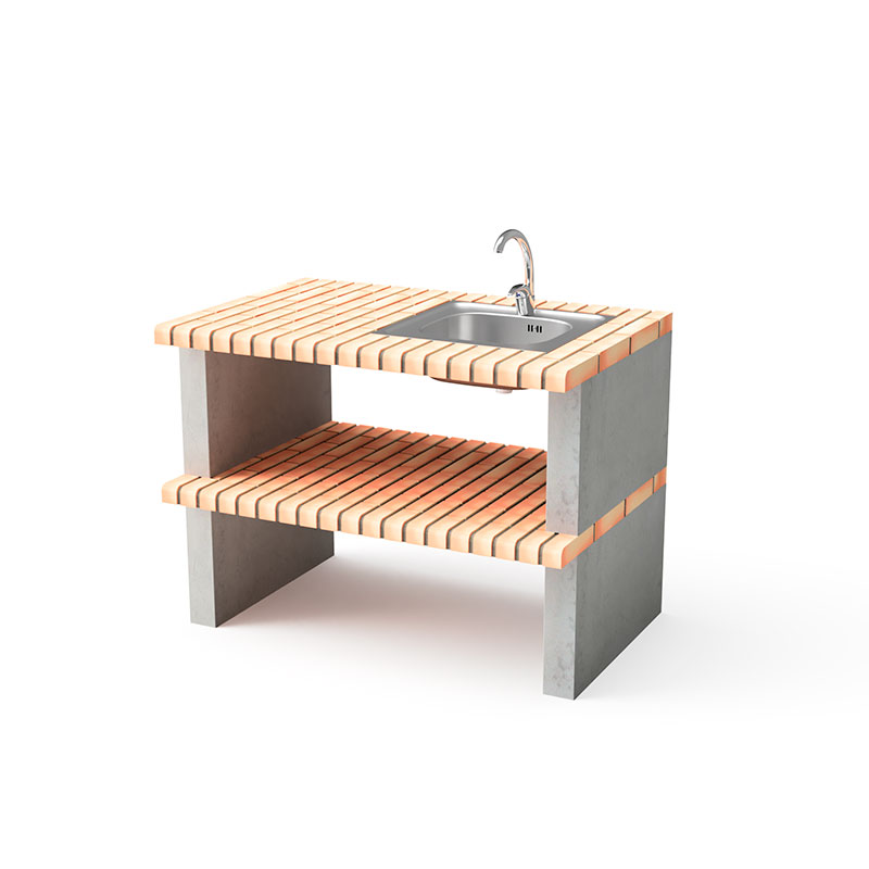 Module in orange brick and refractory concrete with sink & tap. With this element you can have more space in your barbecues to comfortably place your utensils, food, dressings or coal. Lower shelf in concrete and brick.