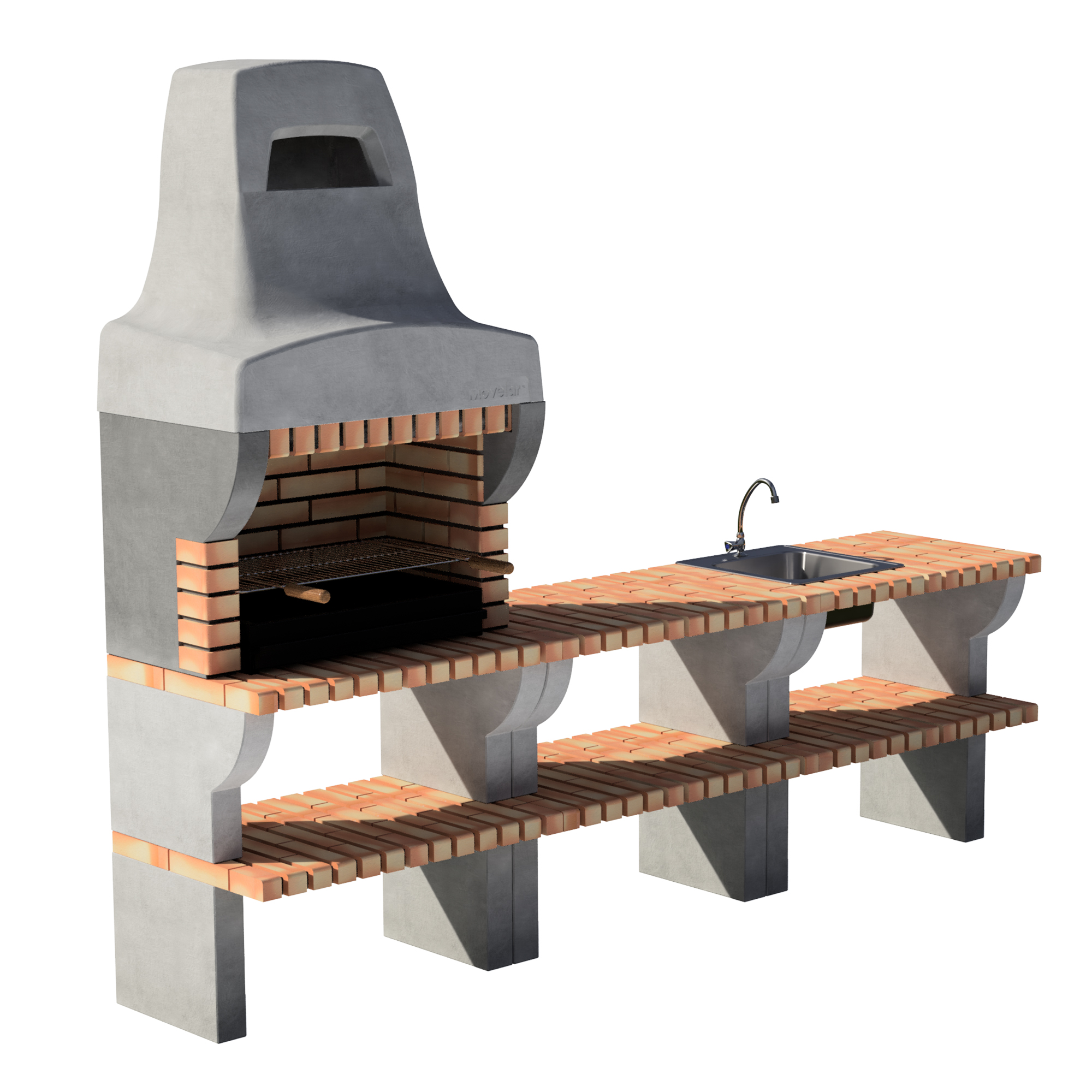 Made of refractory concrete and brick. Complete side table to use with brick BBQs. Stainless steel Sink + Chromed tap. Compatible with BAILEN series. Gray concrete and orange brick.