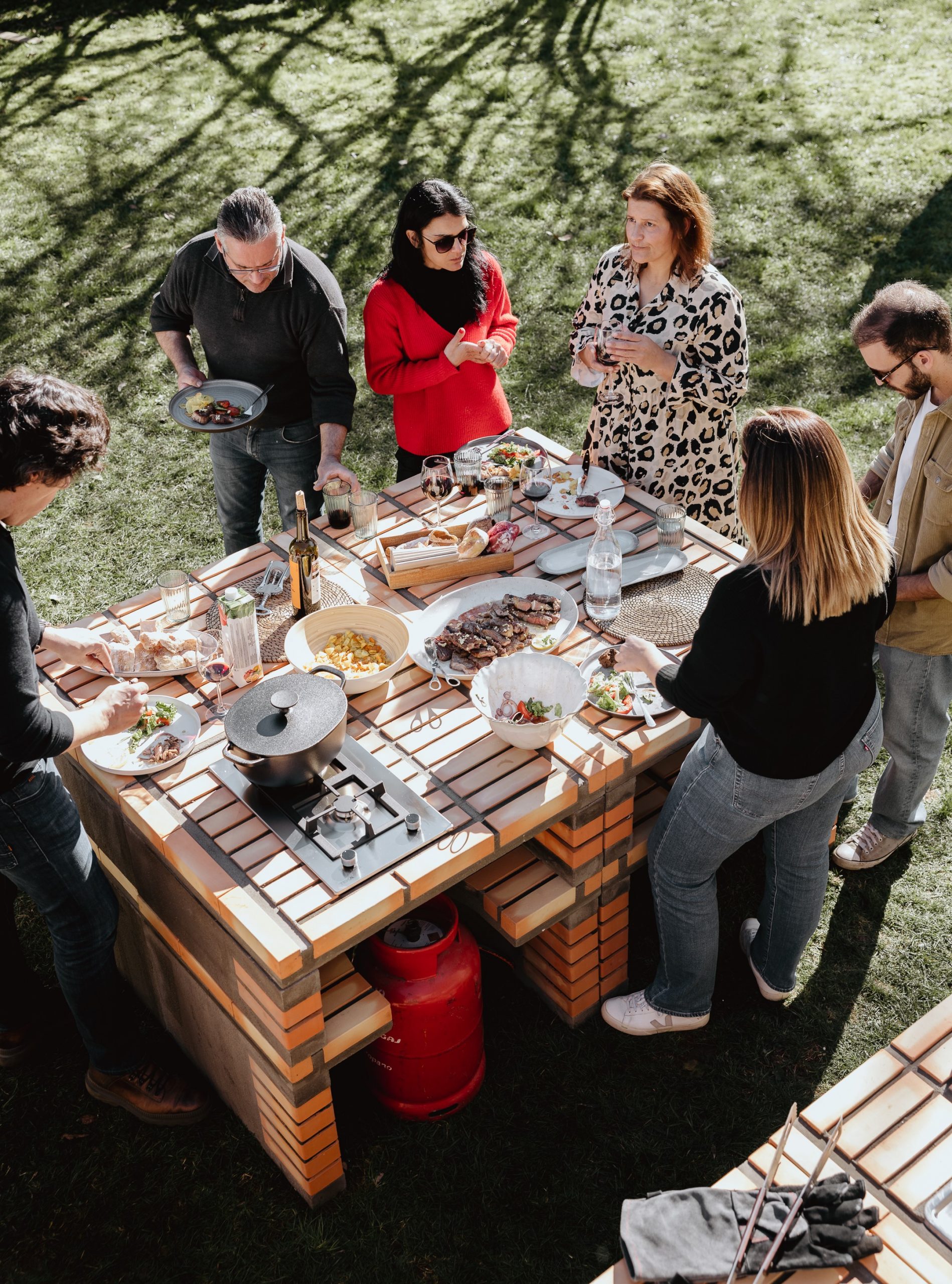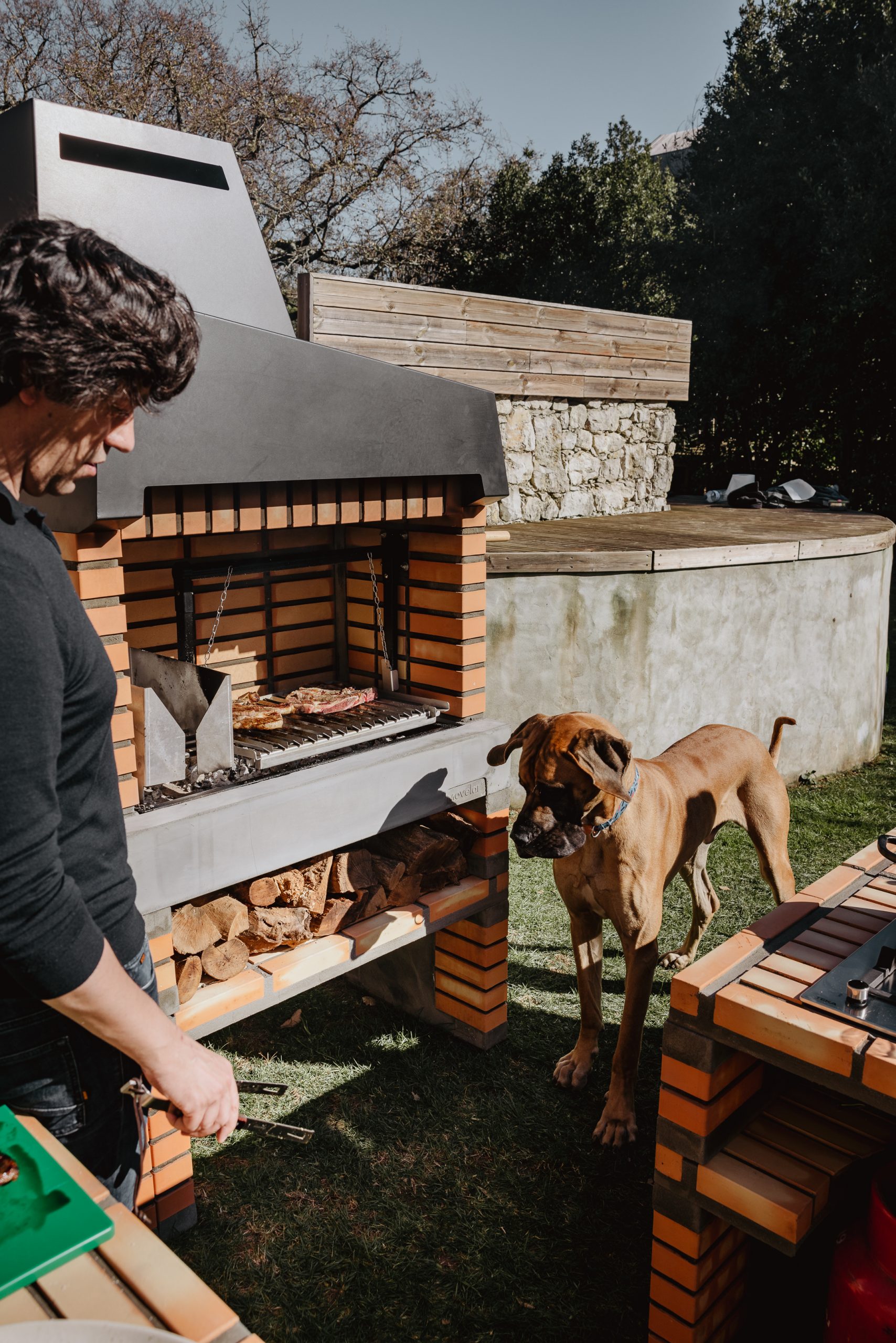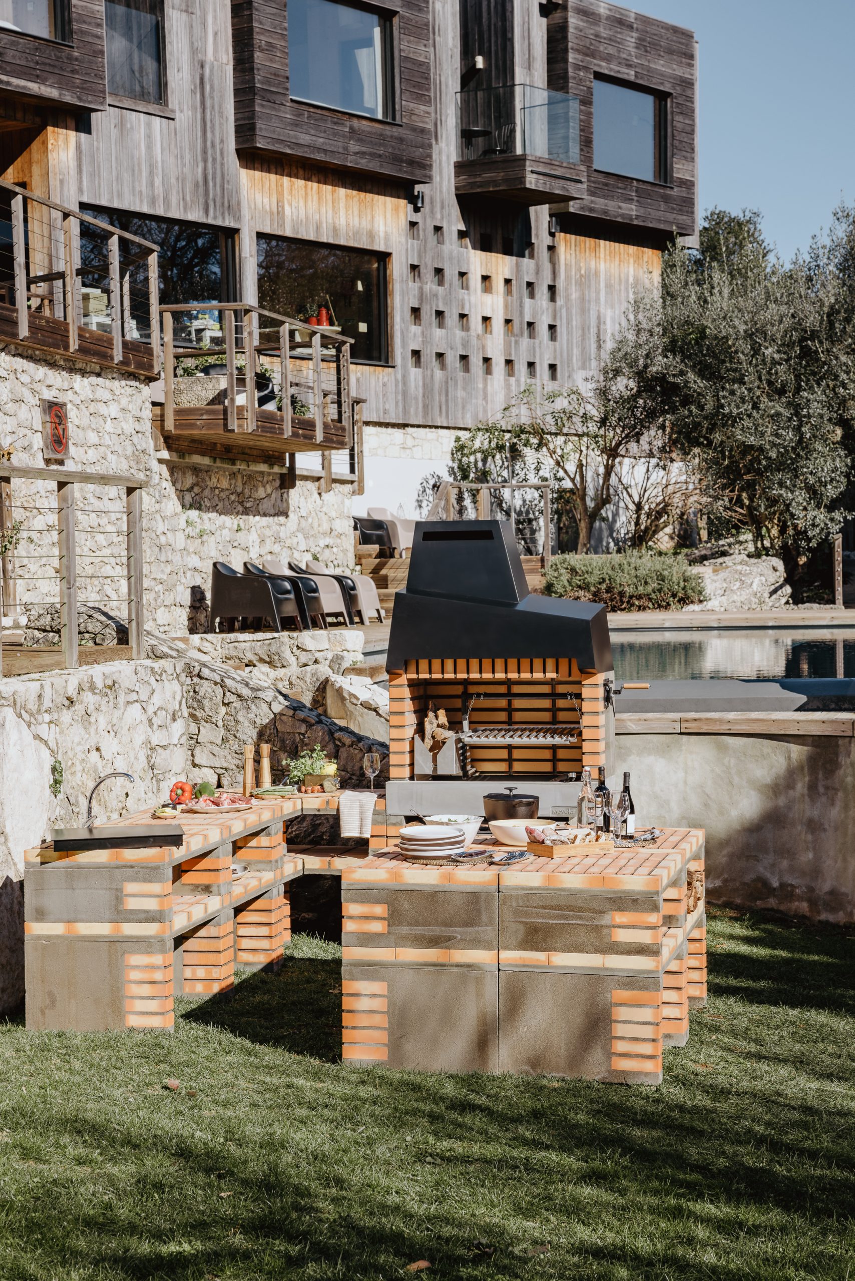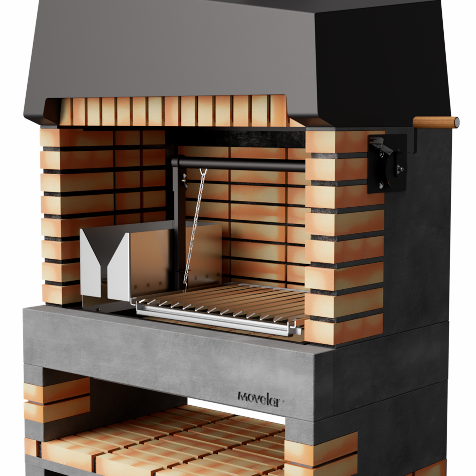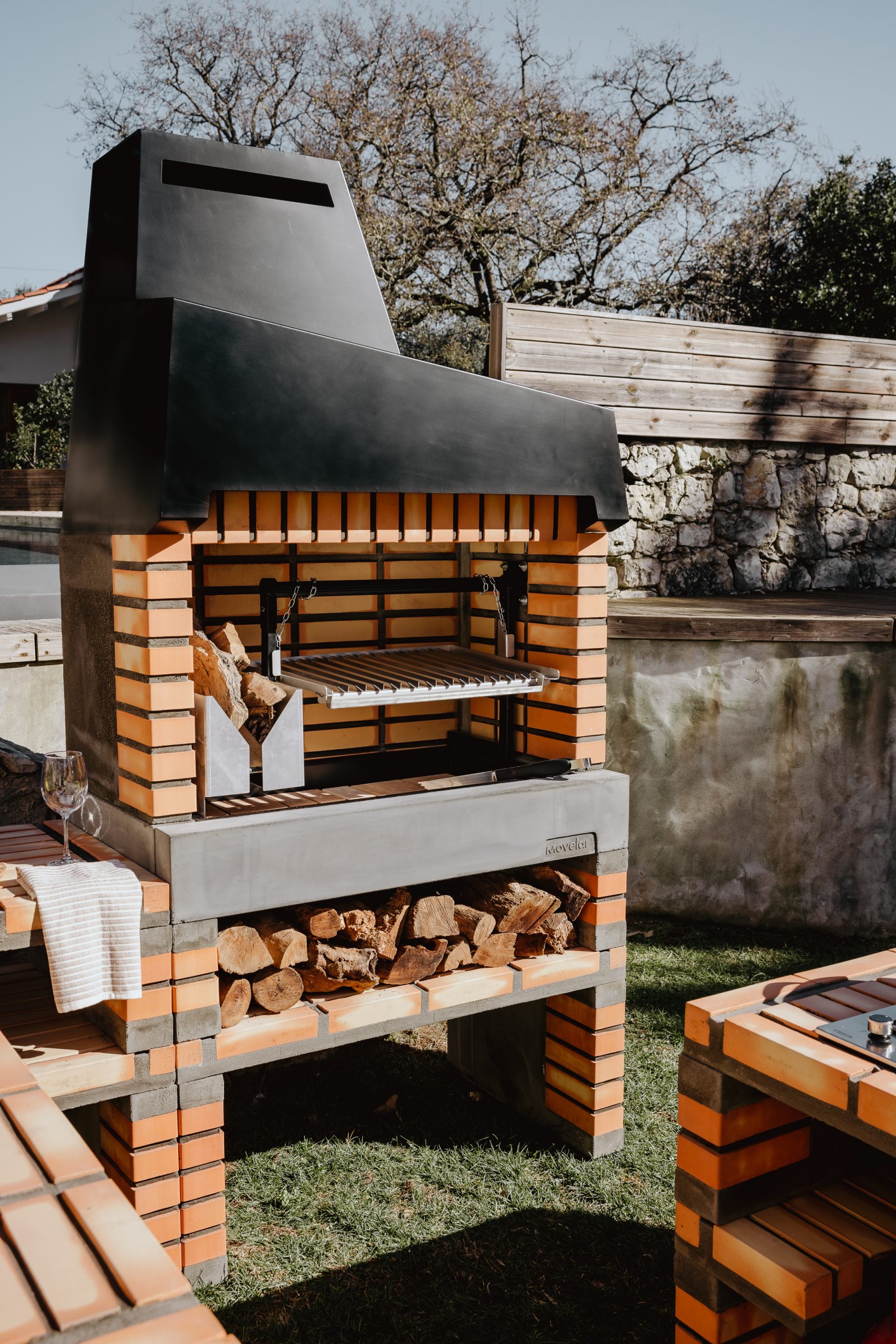 Contemporary design brick barbecue, with a very high performance. Cocking area made of refractory concrete and brick, with a high thermal eficiency.
