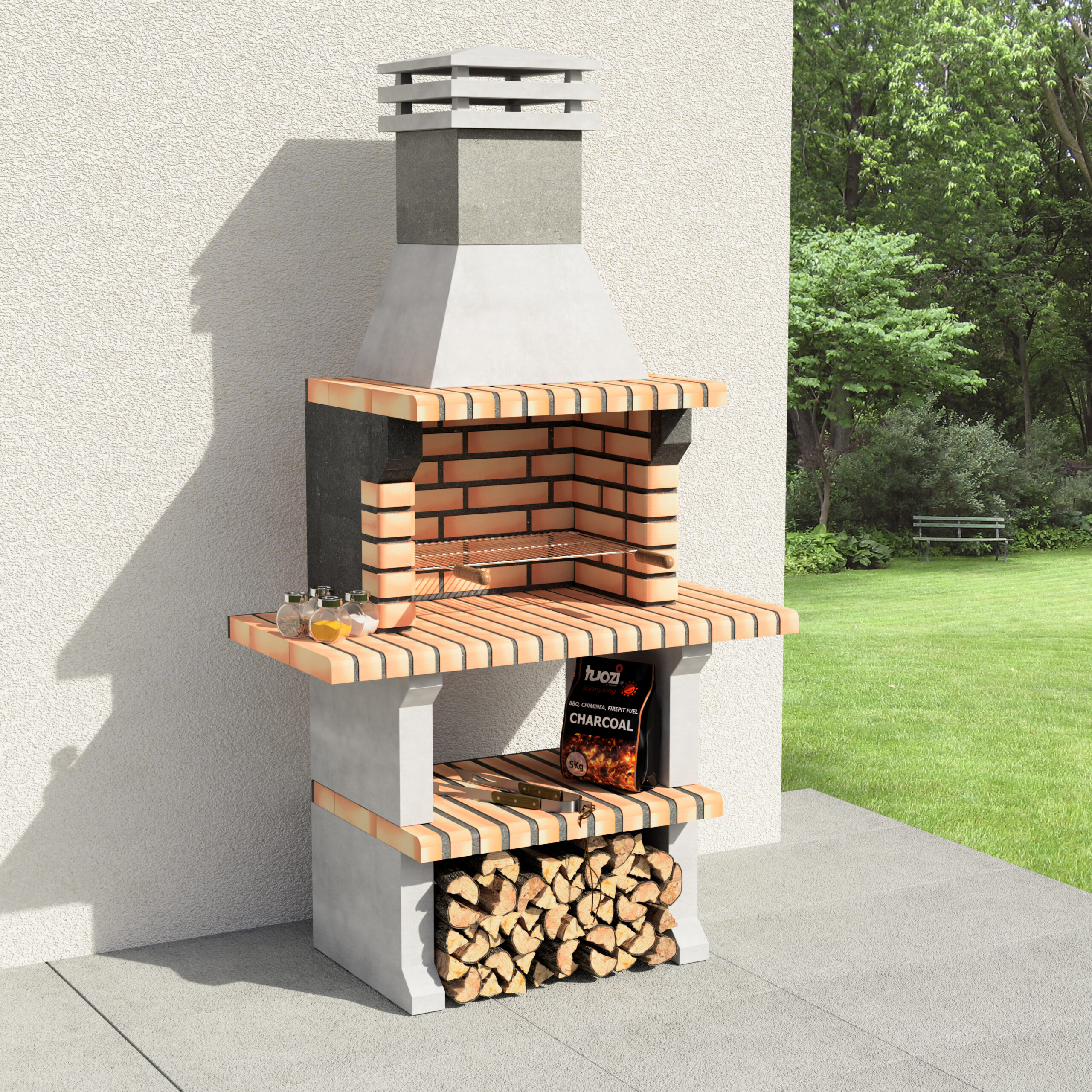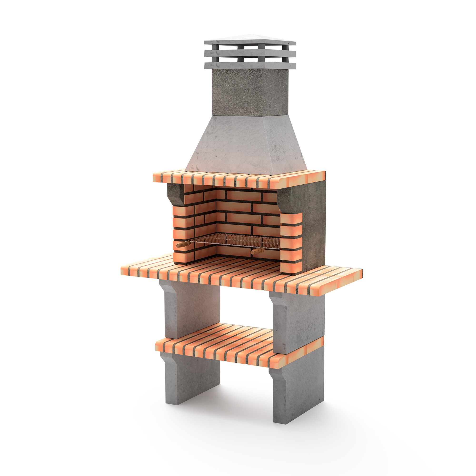 Barbecue made of refractory gray concrete and light orange brick with two small side tables. Zincked grill 61 x 35 cm. Ideal use up to 6 people.