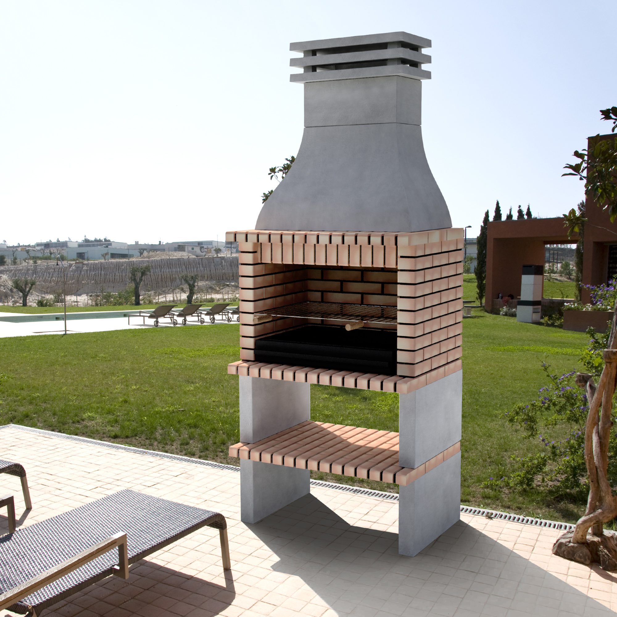Large dimensions barbecue, with a very high performance. Burning area made of solid brick with 9cm thick and a 77cm width grill. Compatible with Argentinian type barbecue accessories. Recommended for 14 people.