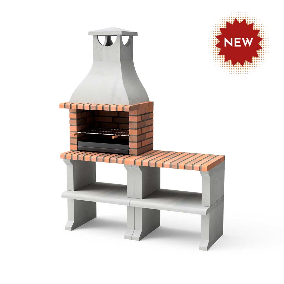 Barbecue made of refractory gray concrete and light orange brick.