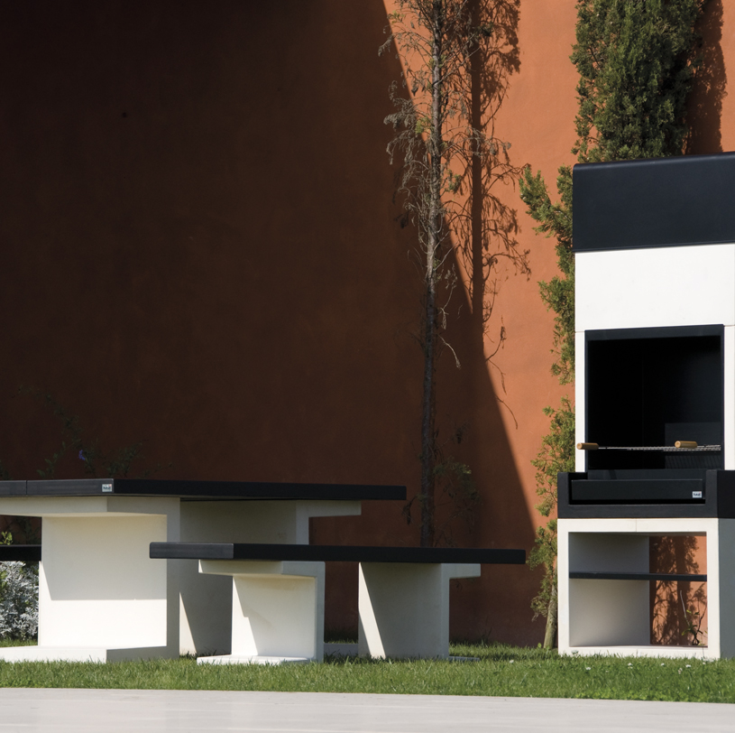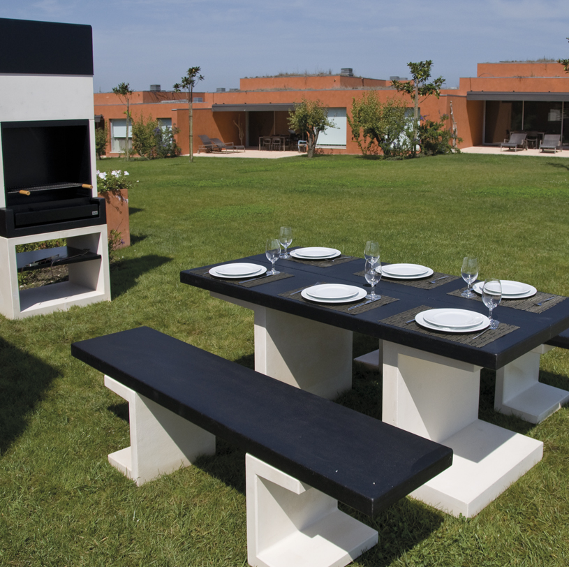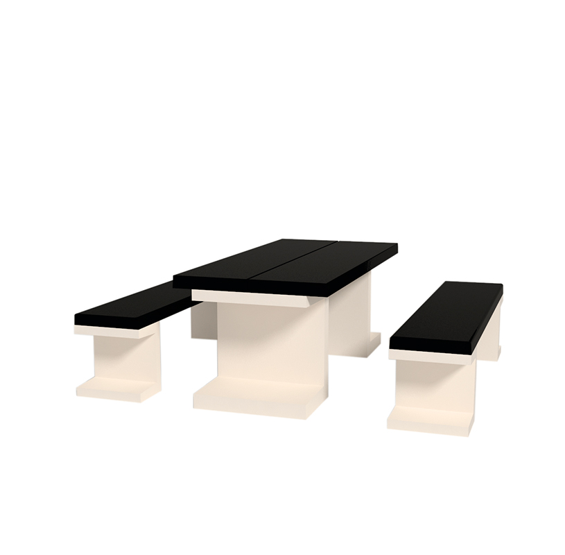 Smooth black and white concrete table and bench surface made of smooth black concrete finished with matte varnish.