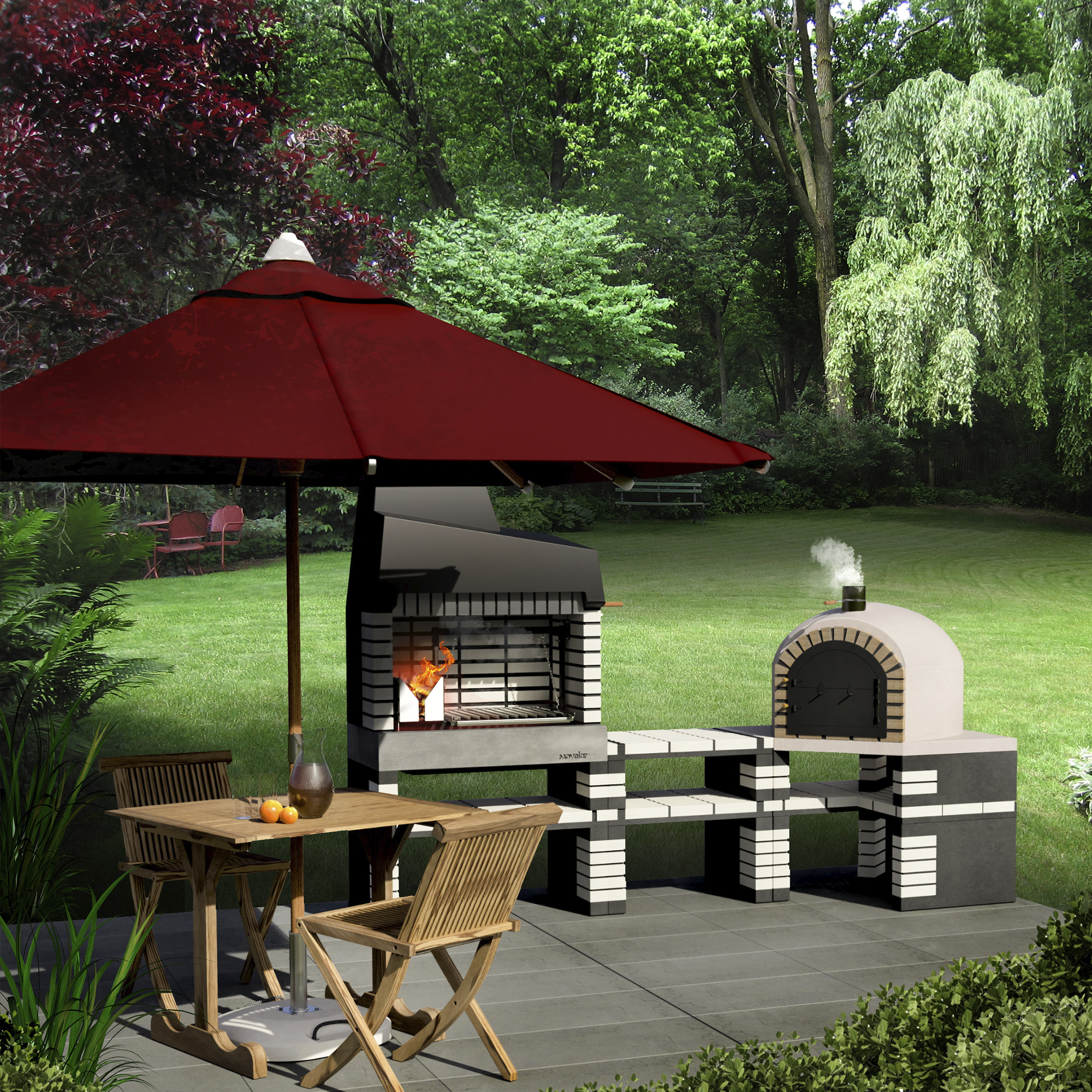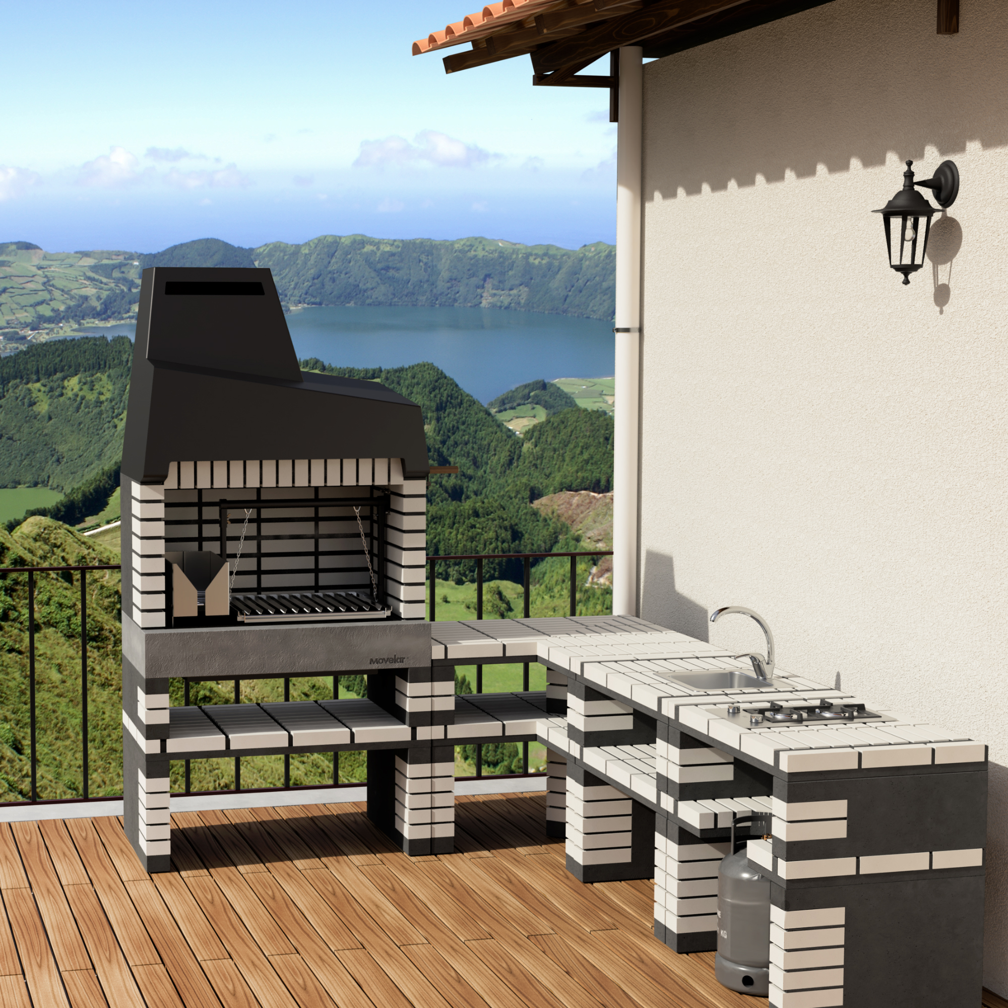 Contemporary design brick barbecue, with a very high performance. Cocking area made of refractory concrete and brick, with a high thermal eficiency.
